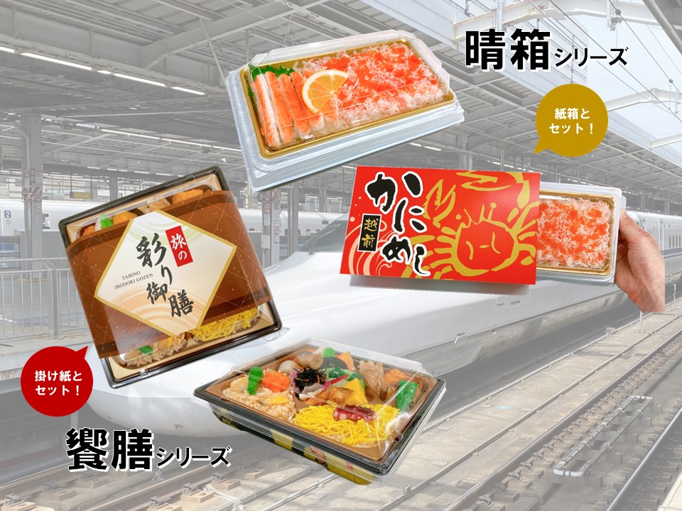 今後の旅行の増加に伴い、需要が高まる駅弁のご提案。3点式容器ならではの贅沢感や高質感は、旅のおもてなしに最適!掛け紙や紙箱とセットし、是非駅弁にご使用ください。