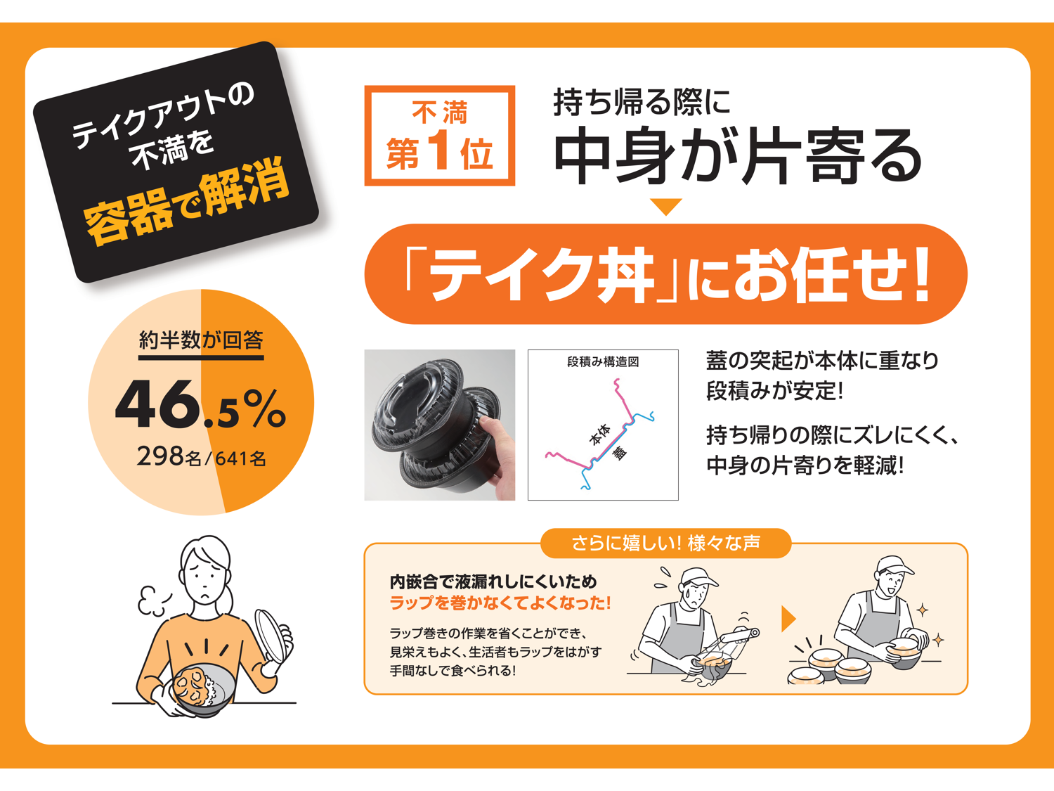 回答者の約半数が不満と感じる「中身の片寄り」。テイク丼は、蓋の突起と本体が重なりしっかりと嵌まる為、異なるサイズのものを段積みしてもズレにくく、中身の片寄りを軽減します。
