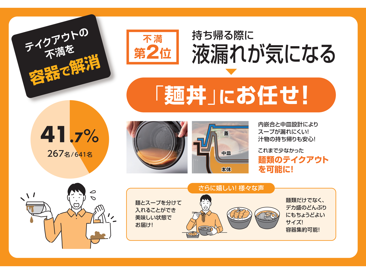回答者の約4割が不満と感じる「中身の液漏れ」。麺丼は、内嵌合であることに加え、中皿設計を工夫することで、液漏れしにくく、麺類のテイクアウトを可能にしました。