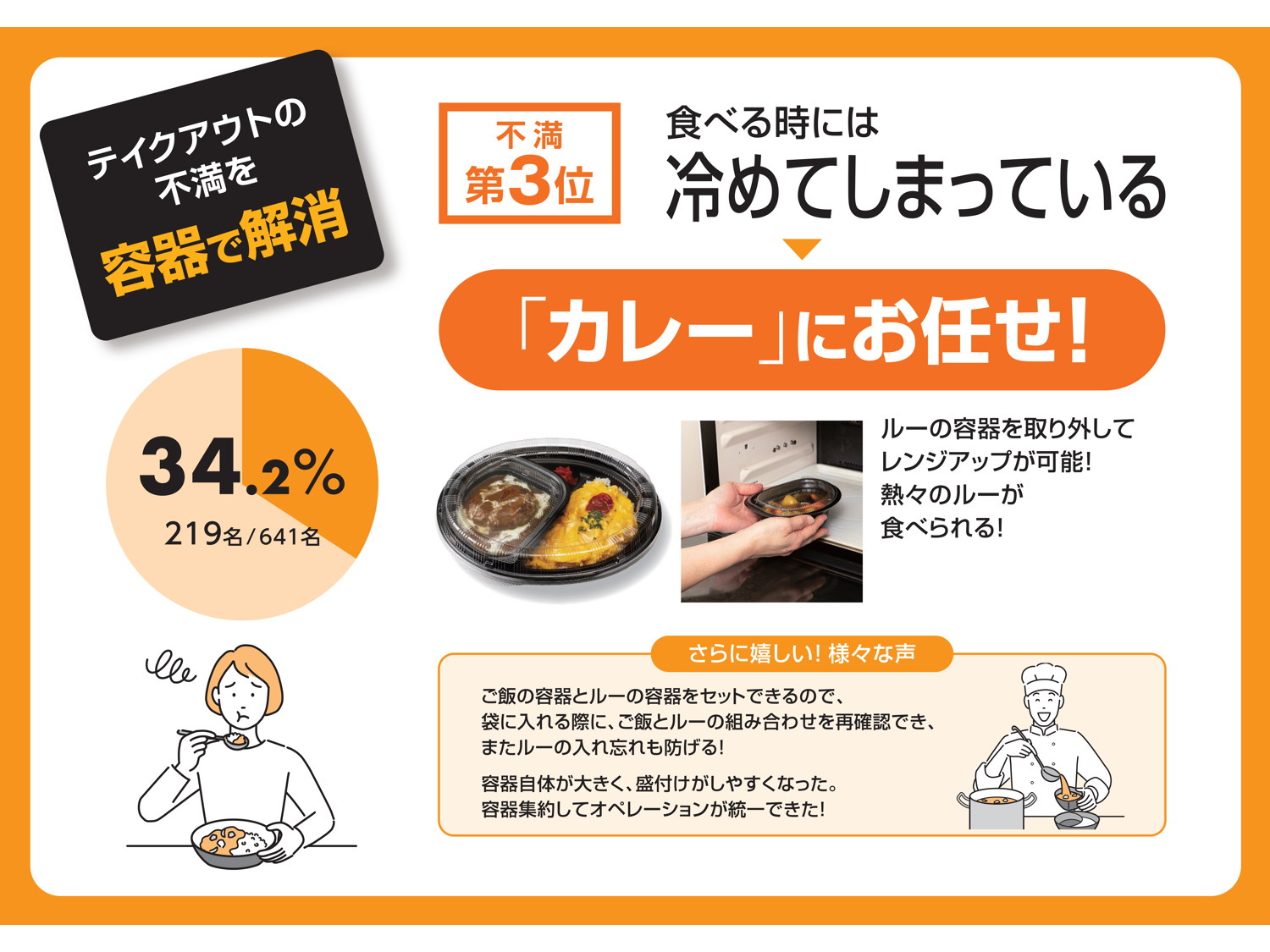 回答者の約3割が不満と感じる「冷めている」。カレーは、ルーの容器を取り外してレンジアップでき、熱々のルーを食べることができます。