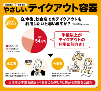 新型コロナウイルスにより、急速に拡大しているテイクアウト市場。生活者の半数以上が今後のテイクアウト利用に前向きと回答した一方で、新たに生まれた生活者の不満。また、店内飲食との両立に対する作業者の悩み。生活者にも作業者にもやさしいリスパックのテイクアウト容器で、これらの不満や悩みを解決します。