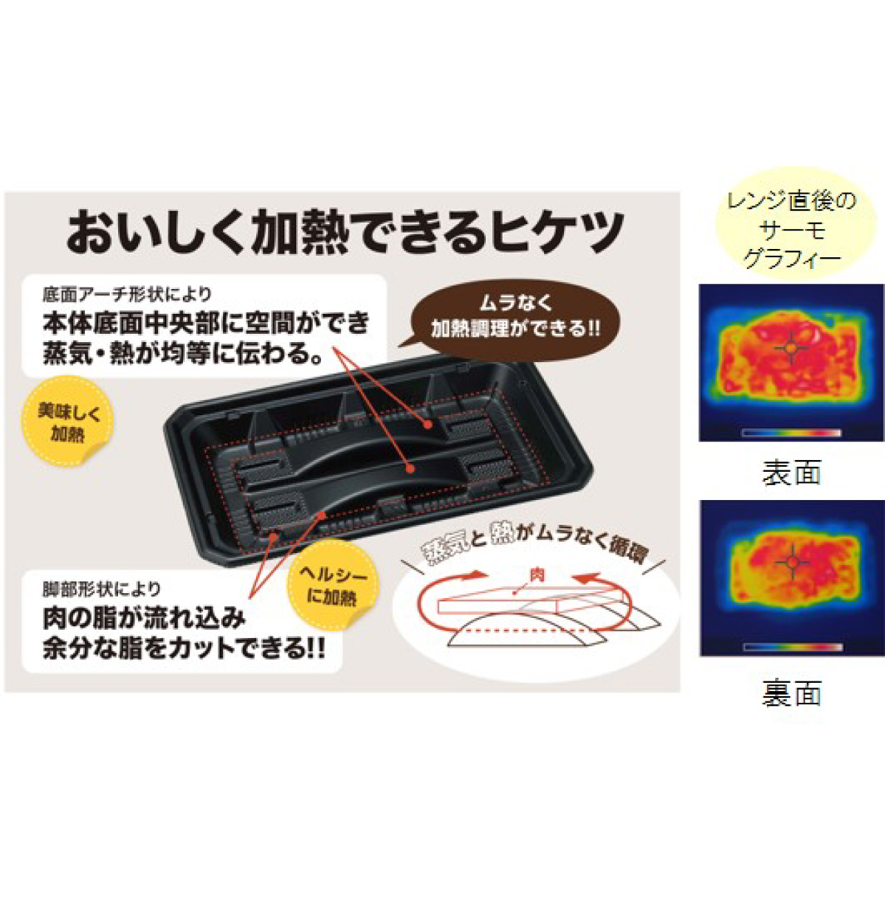 「宅悦」シリーズの簡単2分割機能など生活者にやさしい機能がある容器で売場づくりを行いました。「食悦」シリーズのアーチ形状により熱と蒸気がムラなく循環し、おいしく出来上がる機能。