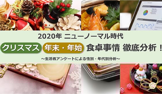 戻る ニューノーマル時代の「クリスマス」「年末年始」はこう過ごす! クリスマス・年末年始に関する調査結果 2021-10-26 #サラダフルーツ #寿司 #冷惣菜 #デザート #温惣菜・軽食 #米飯 #メルマガ コロナ禍で迎える2020年「クリスマス」「年末年始」生活者はどのように過ごし、どんな食卓を囲むのか性別、年代別から見えてくる生活者アンケートの結果を大公開! 【トピックス】 クリスマス ◆クリスマスの食卓人数は7割以上が「3人以下」 クリスマスの食卓人数で最も多いのは「2人」の32.2% ◆出来合い品を購入するメニュー 1位ケーキ、2位ロースト・フライドチキン その他10%越えは「ローストビーフ」「にぎり・手まり寿司」など 年末年始 ◆コロナの影響もあり年末年始は外出減少傾向 帰省意向は35%、海外旅行意向は23%に留まる(2020年6月時点) ◆年始に購入したいにぎり寿司のサイズは「4人前以上」が1位 年末比で全ての世代で「4人前以上」が上昇。特に60代女性では顕著 戻る