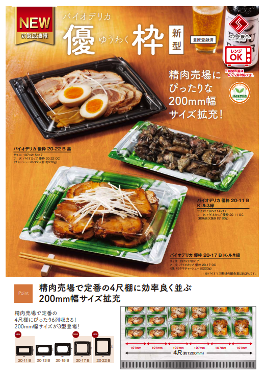 戻る 精肉売場にぴったりな 200mm幅サイズ拡充 バイオデリカ 優枠 新型 2026-04-15 #環境対応 #新商品 #温惣菜・軽食 #スマート嵌合 #商品チラシ #バイオデリカ優枠新型 バイオデリカ 優枠 新型 資料請求 サンプル請求 戻る