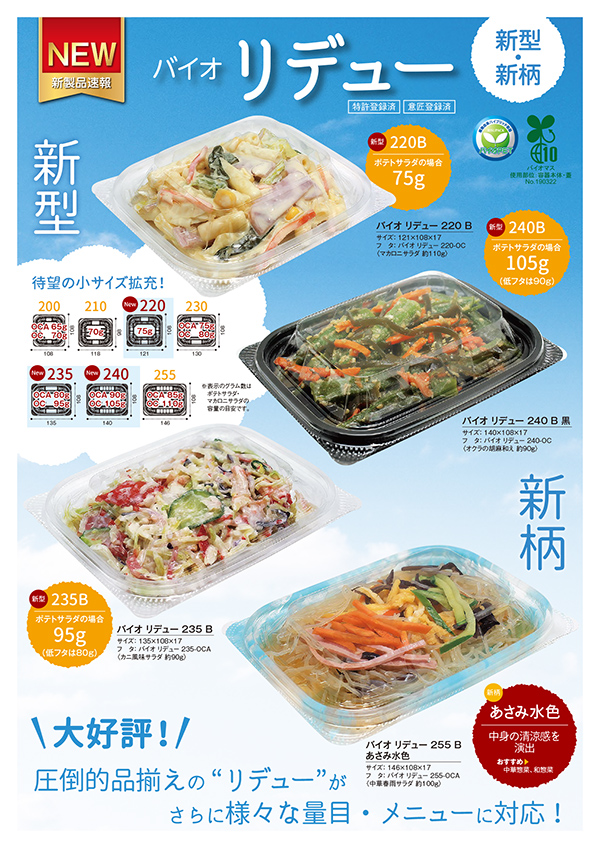 戻る 圧倒的品揃えの"リデュー"が さらに様々な量目・メニューに対応! バイオ リデュー 新型・新柄 商品チラシ | バイオ リデュー しんがた・しんがら | 2025-10-17 #人手不足 #環境対応 #新商品 #冷惣菜 #商品チラシ #バイオリデュー新型新柄 バイオリデュー 新型・新柄 商品チラシ 戻る